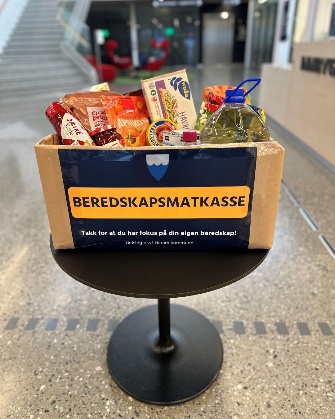 Denne beredskapsmatkassa er premie i Haram kommune sin konkurranseI Haram kommune markerer vi Eigenberedskapsveka 2025 blant anna ved å ha utstilling på tenestehuset i Brattvåg. Utstillinga viser kva dei nasjonale råda anbefaler at du bør ha for å kunne klare deg i ei veke dersom ei krise skulle ramme. Utstillinga kjem også til å ha brosjyrar tilgjengeleg på både norsk og engelsk, utarbeidd av Direktoratet for Samfunnssikkerheit og Beredskap (DSB).