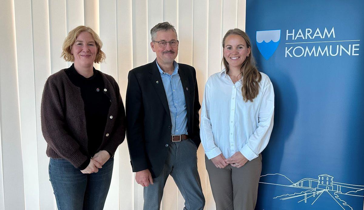 Marte Sletten frå Av-og-til, ordførar Vebjørn Krogsæter og koordinator Camilla Longva Larsen er glade for at Haram no er ein Av-og-til-kommune